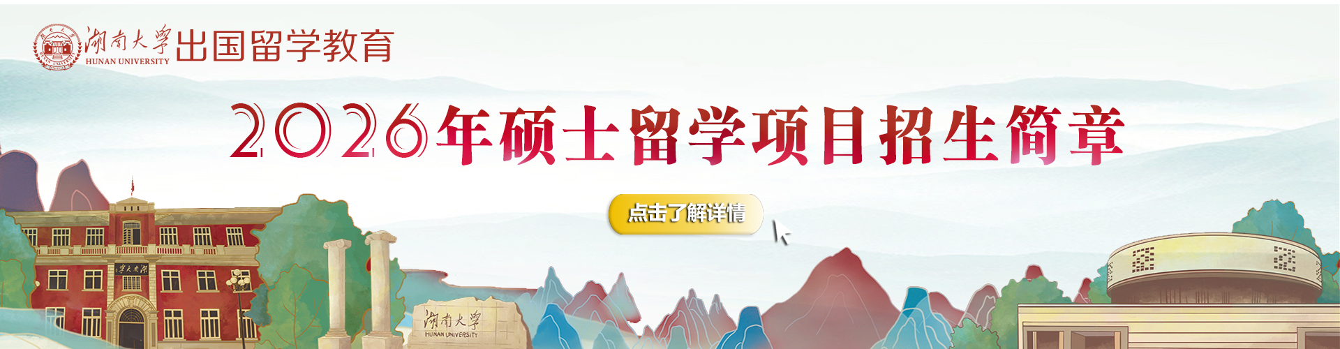 湖南大学与教育部留学服务中心共建出国留学培训基地。学校与英国、美国、加拿大、澳大利亚、新西兰、新加坡、马来西亚、西班牙、德国、意大利、韩国等20余所高校开展了学分豁免留学项目及语言培训项目,办学层次涵盖本科和硕士,专业覆盖工程类、管理类、会计类、艺术类等。累计培养出国留学高级专业人才6000余名,以规范的资质和优良的品质树立了国内知名的国际教育品牌。